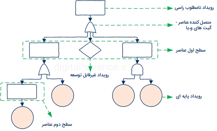 - عناصر را با استفاده از دروازههای منطقی (دروازههای و ، یا) به رویداد راسی متصل کنید و همچنین به رابطهها توجه کنید، به طوری که به شناسایی گیت منطقی مناسب کمک کند.