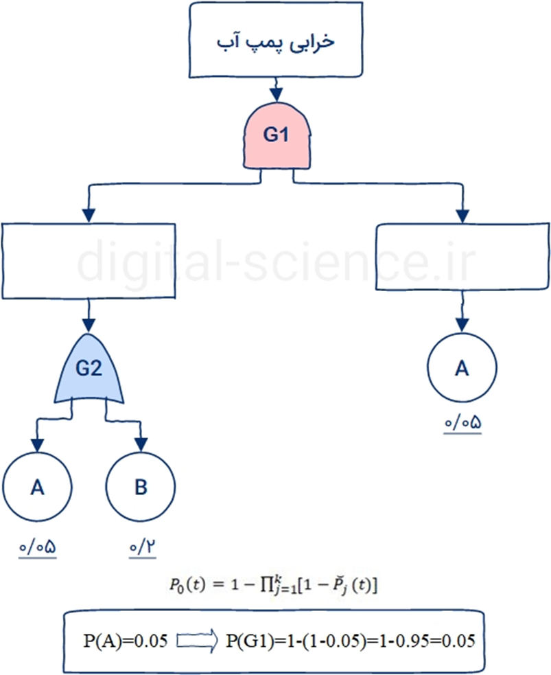 قصد داریم احتمال خرابی پمپ آب را از مثال زیر پیدا کنیم. در این مثال به سادگی مشخص است که مجموعه حداقل برش ما تنها شامد رویداد پایهای A است. یعنی اگر A اتفاق بیفتد با توجه به منطق حاکم بین دروازهها، رویداد اصلی اتفاق خواهد افتاد. بنابراین طبق فرمول بالا به راحتی احتمال خرابی پمپ را محاسبه میکنیم: